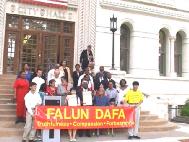 在市政厅的门口,一个呼吁自由的团体盛情邀请大法弟子和他们合影。学员们欣然接受,并向他们介绍大法,他们的脸上露出得闻大法的喜悦。