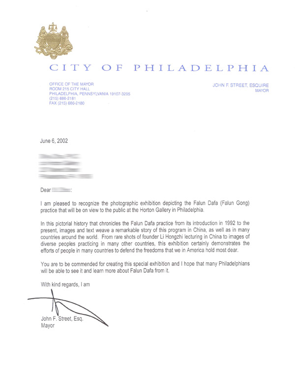 你们举办这一特殊的展览值得嘉奖。我希望很多费城人民能前来参观,并以此更好地了解法轮大法。