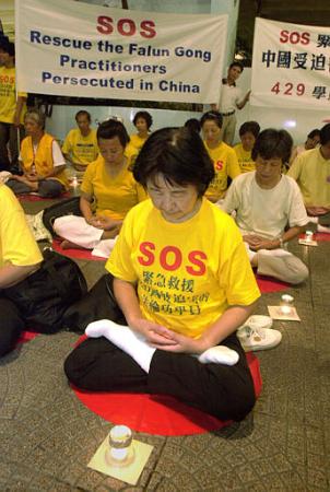美联社图片:香港市区,星期日晚,2002年6月30日,法轮功修炼者在举行烛光守夜活动时打坐抗议中国大陆(江泽民)对其成员的。这场抗议是来港参加香港97回归纪念活动的国家主席江泽民和副总理钱其琛到达后举行的。法轮功成员抱怨说有90名以上来港参加抗议的法轮功成员被禁入境。