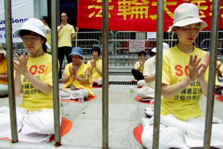 路透社图片(Bobby Yip):2002年6月30日,在香港回归5周年前夕,法轮功学员在警察设置的栅栏后面打坐,抗议江泽民镇压法轮功。一百多名法轮功学员加入了静坐抗议,至少有20名以上希望加入静坐抗议的法轮功学员被拒绝入境。