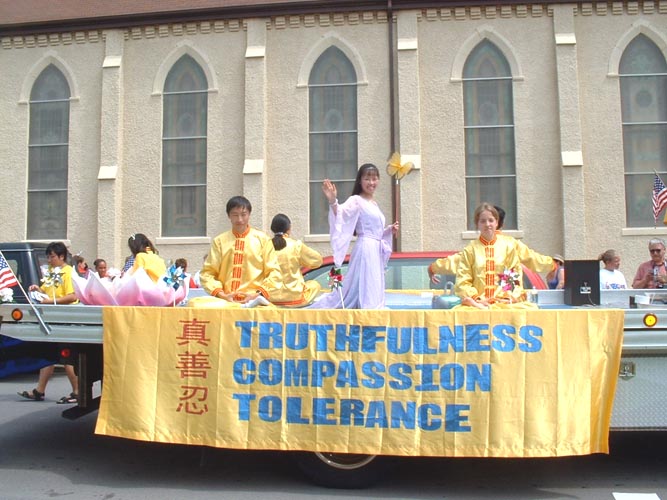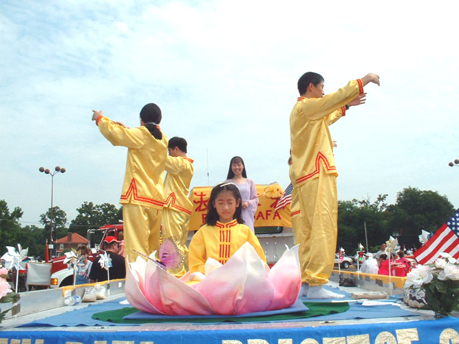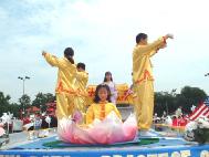 游行时,学员们各司其职。有的学员穿上金黄色的炼功服在游行花车上炼功,其余的学员跟着在花车的两边分发资料,配合得非常自然。学员们宁静平和的表情,柔和流畅的炼功动作,花车上光彩夺目的“真善忍”“法轮大法”等大字,婉转动人的普度乐曲声,以及慈悲祥和的能量场,使我们的花车所到之处受到市民的热烈欢迎。许多市民脸上洋溢着微笑,向我们频频招手致意。我们所散发的真相资料也特别受到市民们的青睐,许多市民主动向我们索要资料,许多市民用双手接过资料以示尊敬;有的市民接过资料后用颇为纯正的汉语“谢谢”来表达对我们的谢意。