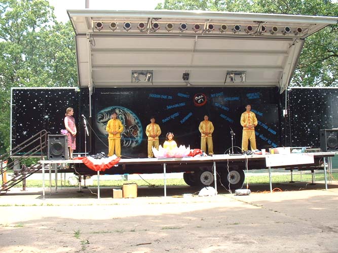 下午,一些学员留下来在预先申请的表演台上继续向人们展示大法的美好,表演的内容有功法展示、舞蹈和唱歌。学员们洒脱自然的表演,声情并茂的演唱以及节目那超凡脱俗的内涵,与周围的喧嚣形成了强烈的对比,深深打动了观众们的心。一对来自云南的母女,主动向我们打招呼问好,并收下了大法材料。当我们说起来国内的江氏政治流氓集团宣传,母亲气愤地说那都是无耻的谎言,她们根本不相信。女儿向我们问了许多问题,如什么是修炼,我们是怎么开始修炼的,我们有什么修炼体会,师父是什么样的人,等等,问了有一个多小时。后来她说她也想炼法轮功,学员给了她一本《转法轮》,她拿过来后高兴地把目录念给她母亲听。最后她们表示非常高兴遇见我们,并且一定会好好读这本书。