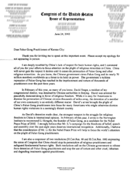 我也是国会两项决议(国会第68号和188号决议)的共同发起人之一,这两项决议表达了美国国会的态度,认为中国应该停止对宗教人士的迫害和保障基本人权。两项决议都呼吁中国政府释放所有被关押的法轮功学员,停止对学员滥施酷刑和其它残酷的、不人道的和侮辱性的待遇。