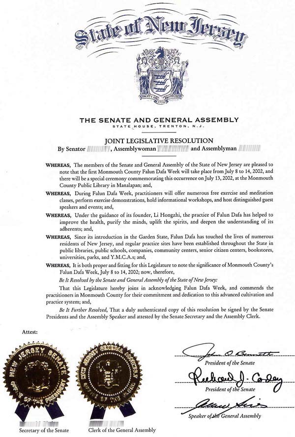 鉴于,法轮大法自从1996年传入新泽西州以来,触及了新泽西州的无数居民,在全州众多的图书馆、学校、公司、社区中心、老年中心、书店、大学、公园和YMCA等处都设有固定的炼功点;并且