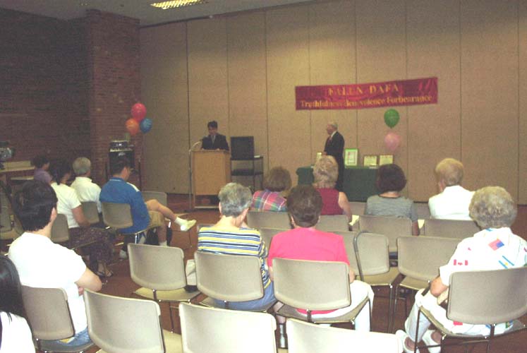庆典仪式于下午两点钟开始。首先,法轮功学员致开幕词,扼要介绍了自宣布首届曼茂斯县“法轮大法周”以来所引起的社会广泛反响和支持,并向十多位曼茂斯县的国会议员、州参众两院议员、曼茂斯县县政会,以及曼茂斯县所属城市的市长和市议会对法轮大法的一贯支持表示衷心的感谢。法轮功学员特别感谢来自曼茂斯县的国会议员浩特先生和伯隆先生对中国大陆受迫害的法轮功学员人权的一贯支持和帮助。