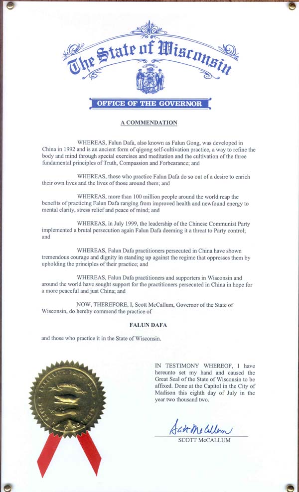 鉴于,在威斯康星州以及全世界的法轮大法修炼者及其支持者们努力寻求人民对在中国遭受迫害的法轮大法修炼者的支持,希望换来一个和平公正的中国。