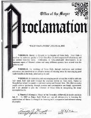 鉴于,李洪志大师通过在世界各地传授法轮大法并鼓励人们按照法轮大法修炼身体、精神和心灵,已经帮助众多的人们获得了生活的宁静和祥和。他为帮助人们通过修炼达到精神升华所做的努力深深受到人们的感激,我高兴地同法轮大法学员一道,共同认同他的成就。