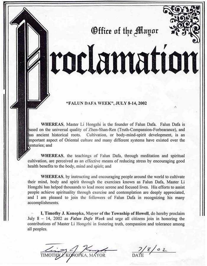 我,豪维尔市市长蒂姆思.J.卡诺克,特此宣布2002年7月8日至14日为“法轮大法周”,并号召所有市民共同表彰李洪志大师在各种族人民中促进“真善忍”所做出的贡献。