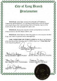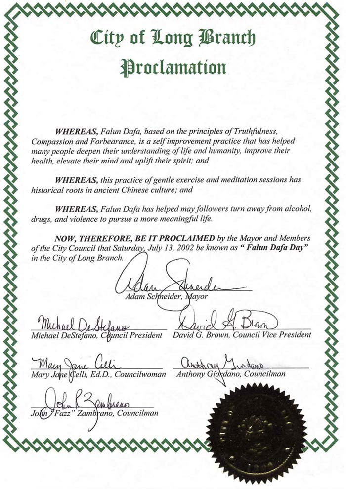 【明慧网2002年7月16日】2002年7月13日,新泽西州长枝市市长亚当-史耐特先生和全体市议员联合签发褒奖令,宣布2002年7月13日为长枝市“法轮大法日”。在褒奖令中,史耐特市长和全体市议员赞扬法轮大法帮助人们加深了对生命与人生的理解,改善了身体健康,净化了思想,提升了心灵,并使许多修炼者戒除了酒精、毒品和暴力,转而追求更有意义的生活。市长秘书代表史耐特先生在市长办公室举行了褒奖令颁发仪式。学员代表衷心感谢史耐特市长和全体市议员对法轮大法的褒奖,并向市长先生赠送了法轮功书籍和录像带。