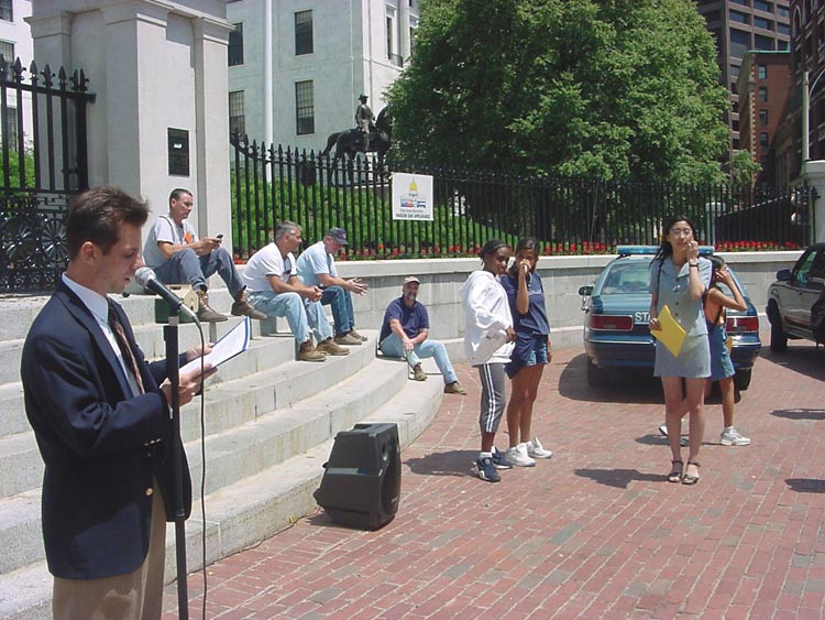 即将18岁的学生简梦阳首先谈了自己及家人去冰岛的遭遇。简梦阳乘坐冰航的飞机于今年6月10日早晨8点抵达冰岛,在过海关前被截止,美国护照被拿走,在机场被扣留3个小时多后被告知因其修炼法轮功而被列入黑名单,并与黑名单上的其他26位同机的法轮功学员一起被禁止进入冰岛,他们随后被临时关在机场附近的学校等候遣返。这些法轮功学员中6人为美国公民,3人为加拿大公民,一位为澳洲公民,其余为中国公民。学员们向冰岛警方解释此行的目的是为了和平抗议江泽民政府在中国残酷镇压法轮功,并向冰岛人民展示法轮功的美好。学员们的友好和善意打动了警方,警方允许学员们延长一天的逗留时间。冰岛政府禁止入境的命令在冰岛全国引起激烈的反响,冰岛人民开始自发地组织游行示威,抗议政府的决定。