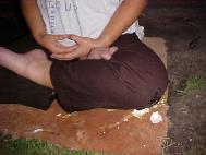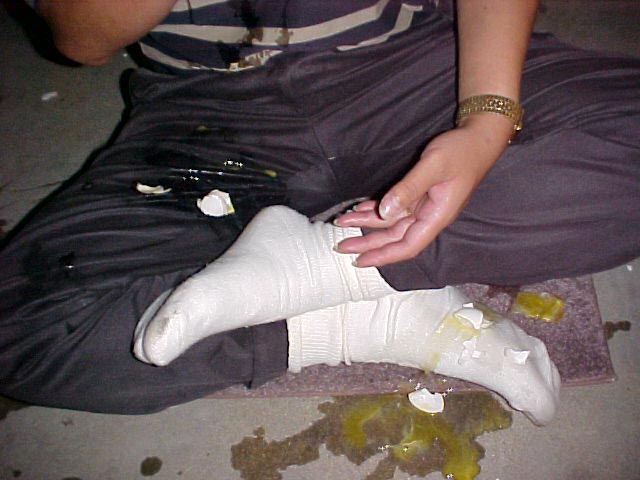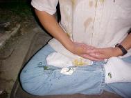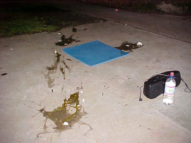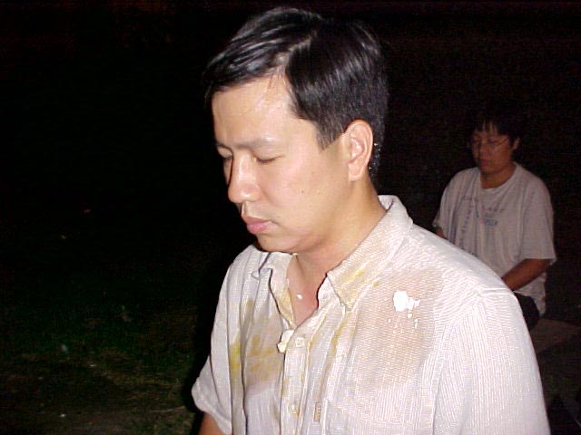 到了晚间十点五分左右,当学员们宁静地坐在垫子上闭目打坐发正念时,突然有人从前面马路上一辆行驶的轿车内投掷多个鸡蛋袭击他们,击中了其中一位男学员的手掌和脖子侧面,他看见是一辆黑轿车。另一位女学员的大腿侧上方也被鸡蛋掷中,学员们不受干扰,继续静坐发正念,谁知这辆轿车驶了一圈转回来,又朝学员们投掷了更多的鸡蛋,那位男学员腿上溅满了鸡蛋,一些鸡蛋掷到学员们的周围地上,然而,自始至终,学员们一直宁静地盘腿打坐发正念,一动不动。