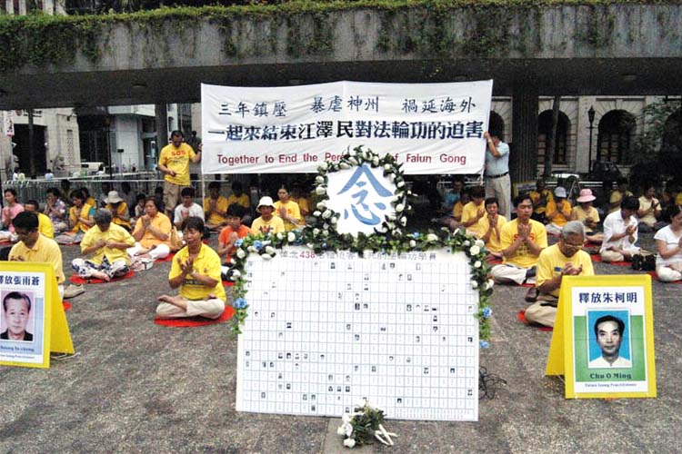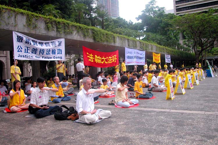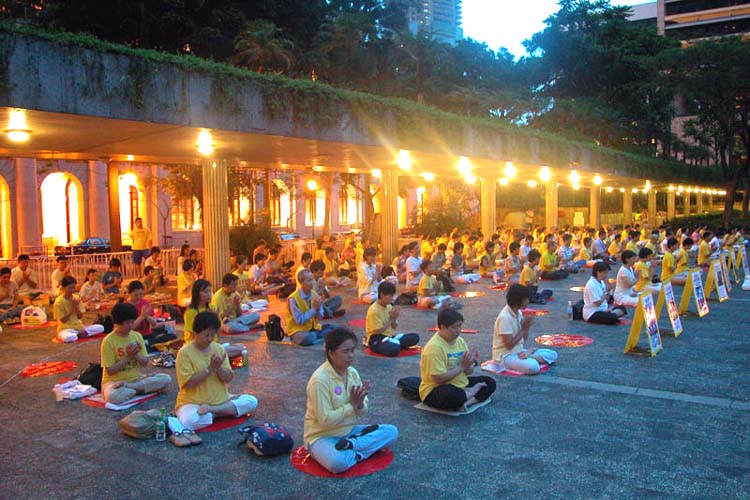 下午四时,法轮功学员也在遮打花园开始了静坐请愿行动,他们张起写上“历史上一切迫害正信的从来都没有成功过”、“一起来结束江泽民对法轮功的迫害”等横幅,排列整齐地炼功及发正念。晚上七时至十时,学员举行烛光悼念活动,在四百多名被迫害致死学员的花圈前,用蜡烛砌成了“STOP PERSECUTING FALUN GONG”(停止迫害法轮功)的英文字句。