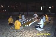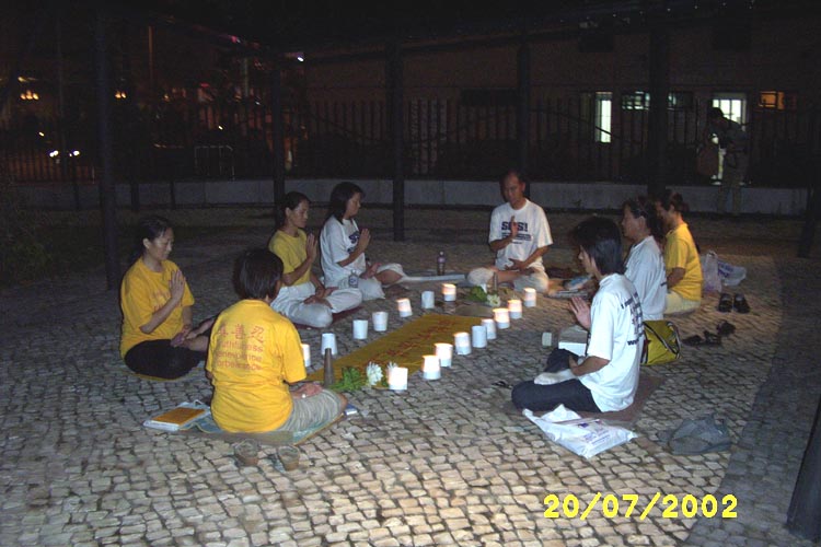 清晨5点至7点,学员们在中联办对面的花园发正念、炼功。整个下午在葡京酒店前面的空地向游客民众派发法轮功真相资料。晚上8点至10点,法轮功学员在中联办对面的花园举行烛光晚会,悼念4百多名被迫害致死的大陆学员。摇曳的烛光,洁白晶莹的莲花,庄严肃穆祥和的气氛中,学员们发正念、学法、交流心得,更加坚定了修炼大法的决心。
