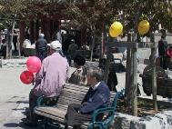 | 学员向当地华人讲真相 | 老华侨手持印有法轮功字样的气球 | |