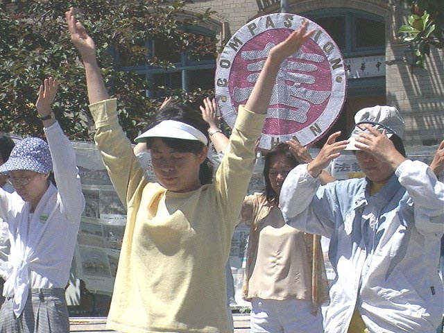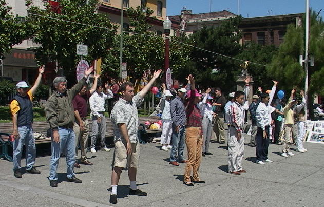 学员们一大早就在旧金山市的市政厅、金门公园、华盛顿广场三处进行了集体大炼功。宁静祥和的炼功场面吸引了许多行人和游客。许多从世界各地来旧金山的游客一下大客车,就来看我们的真相展板、拿资料、和我们攀谈、并照相留念。