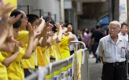 【明慧网2002年7月22日】2002年7月20日,香港法轮功学员星期六在中联办附近炼功,抗议中国(江泽民)政府镇压法轮功三周年。(美联社图片)