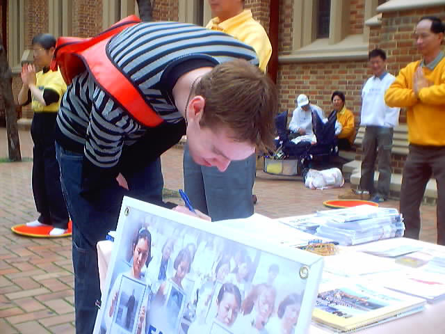 后来我于2000年夏天接到了海外一所大学经济学院的入学通知书,并取得了全院最高的奖学金,攻读经济管理硕士。那是一个美丽、整洁、一切都有条不紊的国家,人民安居乐业,虽然学业非常繁重,但是在那里的生活很开心,因为我又可以在蓝蓝的天空和绿绿的草坪上和功友们一起自由的炼功了,再也不用担心会因此而被遭拘捕了。海外的生活更是让我亲眼目睹了法轮功在海外洪传的盛况,这一祥和的功法在海外五十多个国家和地区迅速洪传,这恐怕也是迫害者始料不及的吧。虽然人们一开始听到的都是从中国官方报导转载过来的对法轮功的污蔑之词,但是当人们亲眼目睹了法轮功的祥和及法轮大法修炼者身上所展现出来的善良、慈悲、理智和大忍,无数善良的人们被深深地打动和吸引,谎言不攻自破!其实早在师父92年刚刚开始出来传法的时候,就说过:将来世界上会有很多人来学这个法,世界上人人都会知道法轮功。其实对于今天所发生的事情,特别是中国所发生的一切,在世界上很多国家的一些先知者,预言家都有所预言。想想,在短短十年时间内,法轮功迅速传遍全球五十多个国家和地区,上亿人修炼,取得众多褒奖,超越一切种族、肤色、年龄、文化、国家的界限,所到之处如一股清流,净化人的心灵,提升人的道德,这决非人力所能为!然而在海外,每每看到从大陆出去的民众,向他们提及法轮功时的神态,心里便不觉感到心疼,那是在从世界其他任何地区来的人们脸上都找不到的表情:害怕、冷漠和麻木。我感到深深的悲哀!我在想中国人民啊,确实经历了太多的磨难和挫折,经历了太多的运动和斗争,面对再一次的全民洗脑和残酷镇压,人们真的麻木了,但是,诚如孔夫子曾说过的:“人之初,性本善”,当我一遍又一遍地友好耐心地告诉从国内那样一个封闭的环境中来的人们,在那表面虚假的“繁华”和平静之下掩盖着怎样的浩劫和悲哀,人们整天听到、看到的都是怎样赤裸而又肤浅的谎言,镇压者怎样的残暴和修炼者在如此不公对待下所展现出来的怎样的善良和大忍,我真的从人们眼中读到了越来越多的真诚和理解,从那麻木表情的背后看到了越来越多那曾渐渐逝去的善良。是啊,真善忍,这是生命赖以生存的根本啊!谁能离开他呢?如果一个生命连真善忍都要背离,都要打压,都要反对,那不等于是鱼儿要离开水,人要离开空气一样吗?其实我所做的一切不过是想以我作为一个法轮大法修炼者的亲身经历告诉人们:“请一定记住,法轮大法好,真善忍好,你的生命会因为这一念而拥有美好的未来,真的。”