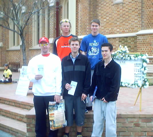 大部分学员们穿着有“法轮大法”、“真善忍”字样的白色上衣和白色裤子,不断地在广场中心演示五套功法,有三个学员在队伍前面的三个很大的莲花座垫上炼功,路人纷纷取要大法资料,驻足观看,学员们也不断地向行人介绍功法和讲清迫害真相。