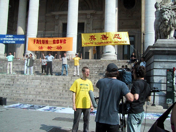 有的行人看后,还为他们的朋友拿资料。不断地有行人鼓励我们。比利时一家大的电视媒体也特意赶来录像,采访学员。