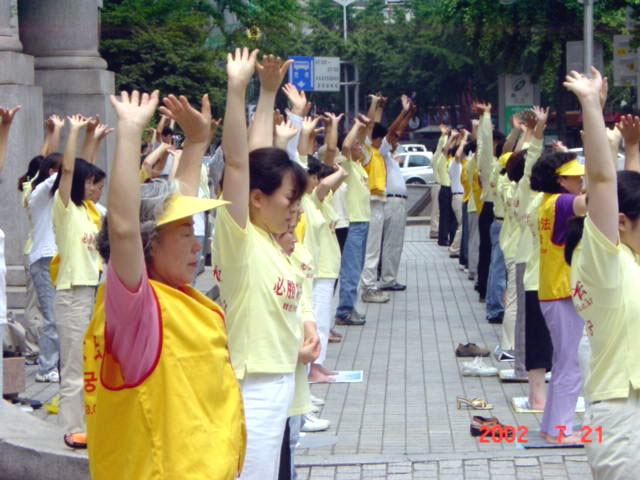这一日,汉城地区的数十名韩国学员来到中国驻韩大使馆对面的韩国银行前面,进行了和平请愿和讲清真相活动。12点55分(北京时间11点55分)至1点10分开始了与世界各地的大法弟子同步发正念的活动,庄严神圣的正念之场和大法弟子的浩然正气震撼寰宇。他们又向人们展示了优美舒展的法轮功前四套功法。这里人潮如流、车水马龙,市民们望着“法轮大法是正法”、“法轮大法好”和“江泽民立即停止对法轮功的镇压”等大横幅,眼里闪现出敬佩的目光,并认真阅读学员发给的真相传单。