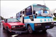 人民网7月21日消息,19日由于雨天路滑,不少地段发生撞车事故,图为下午15时35分,在莲阪富山大转盘发生一起的士车(DT2100)与中巴车(DT3403)争道抢行发生相撞,造成部分道路受阻。