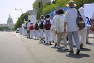 上午十时,法轮功学员列队游行,他们从中国大使馆出发,经康涅迪格大道,宾夕法尼亚大道和宪法大道,游行至国会山西草坪。他们举着写有“一起结束在中国大陆对法轮功的迫害”、“善良的人们请来了解法轮功的真相”、“法轮大法好”等横幅,并沿路播放法轮功的音乐“济世”。