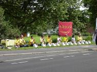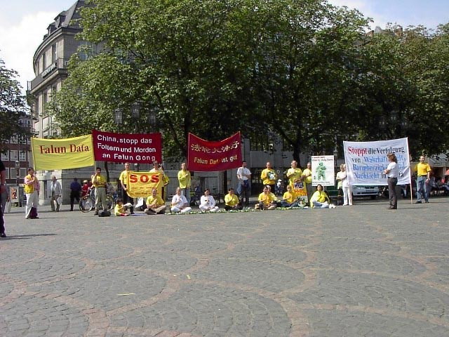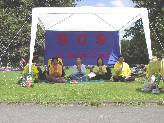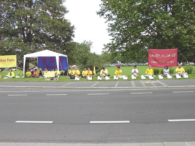 【明慧网2002年7月25日】七月十九日开始到二十一日德国大法弟子在Bonn-Bad Godesberg的中国领馆前进行了五十二小时的静坐。这天天气非常好,几乎没有一点风。我们每小时发一次正念,使已经十分衰弱的邪恶势力更加衰弱了。大量的横幅和展板将我们的信息清楚地传达给了所有开车经过这里的人和过路人:“江泽民集团停止对真、善、忍的迫害”、“法轮大法好”。