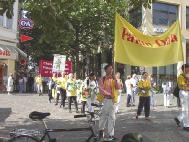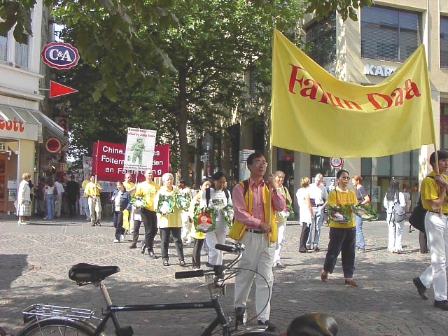 接着又开始了从市中心到Bad Godesberg的游行。这次在一位友好的警察的陪同下,我们游行穿过了购物中心──这里曾是波恩的外交官们的居住区。当看到被虐杀的年轻的大法弟子们的相片、横幅和展板时,人们脸上的表情是那么的严肃。