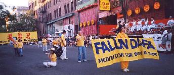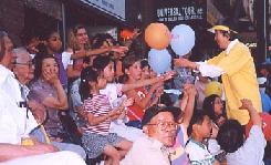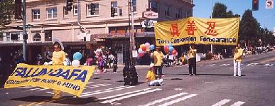 三次游行中我们举起了“法轮大法──性命双修功法”的英文横幅和十尺高的“真善忍”中英文大横幅。路旁的市民向我们挥手致意,为我们的功法表演而鼓掌。派资料的学员都忙不过来,尤其小朋友们伸上小手来索要气球,更令人应接不暇。每次游行当我们来到主席台前,一位学员就递上一份仅几句话的法轮大法的介绍。主席台主持向观众宣读,这样便把大法简明扼要地介绍给了观众。