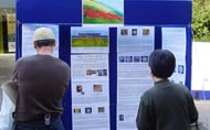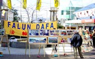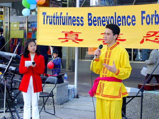 在表演舞台及街道的另一端,是大型正法之路图片展。街心大圆环中间悬挂着中英文“法轮大法”巨型横幅,沿圆环周边的正反两面架子上摆放着近百余幅精选出来的大型彩色照片,展示了法轮大法十年洪传世界的盛况及3年来中国江泽民政府对法轮功和法轮功修炼者的残酷迫害。人们仔细地观看着每一幅图片。一位西人保安花了很长时间,一幅不漏地把全部图片看完。另一位西人男士看过图片展,拿着大法单张,请大法弟子用中文拼音发音“真、善、忍”,并认真地用中文拼音写下来。他说,世界需要“真、善、忍”,江泽民政府迫害修“真、善、忍”的好人,太差劲!糟透了!镇压必须赶快停止!
