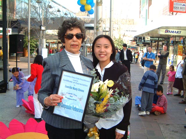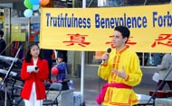 议员史蒂文女士到场表示了祝贺及支持,她说,法轮大法会使社区人民受益无穷,我们真心支持法轮大法“真、善、忍”在卓士霍社区的所有活动。同时,她感谢大法弟子的邀请,给了她走近法轮大法的机会。接着,小弟子向议员献了鲜花,大法弟子对她的支持表示感谢。节目主持人在表演期间向人们介绍了法轮大法,五位西人弟子分别谈了自己的修炼故事,使人们深受感动。好几位当地居民(华人、西人均有)即刻表示想学炼法轮功,询问炼功点详情。在表演舞台附近,有4个大法资料信息台摆放着中英文大法资料。