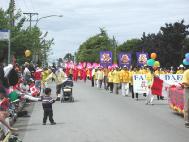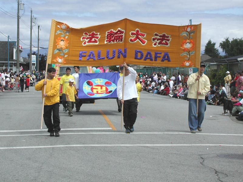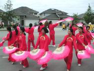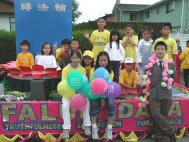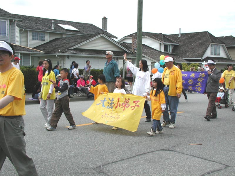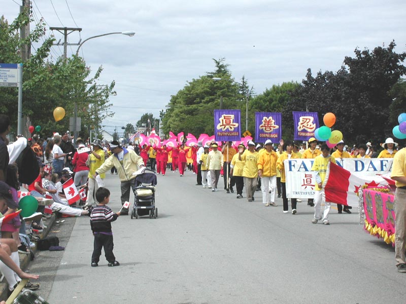 随着美妙祥和的普度音乐,行进着的学员们微笑着向市民们挥手致意,精彩的扇子舞和小弟子的功法表演赢得了市民们的阵阵掌声,人群中不时地传来支持赞许和鼓励。游行期间学员们还及时的向沿途观看群众发放讲清真相的材料,这是温哥华法轮功学员第五次参加烈治文市的国庆游行。
