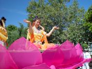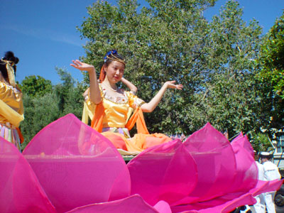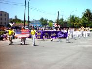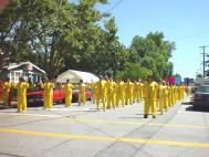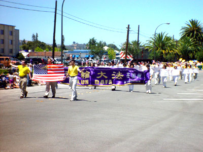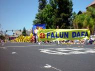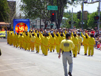 【明慧网2002年7月5日】旧金山湾区200多名法轮大法弟子于七月四日上午参加美国国庆节红木城庆祝大游行。为了更好地给世人展现法轮大法的风采,,救度众生,有的学员今天清晨4点钟就赶到游行地点,装配游行花车,排练舞蹈节目。在学员的精心准备下,数百米长的十分壮观的游行队伍组建起来了。队列整齐、服装鲜艳瞩目,引来观众的热烈欢迎。