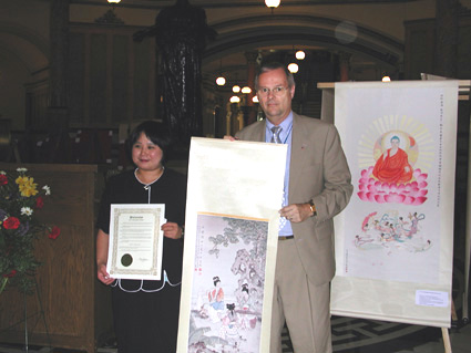 市长助理送来了市长HASARA的褒奖,章翠英向市长和许多州参众议员赠了画作的复制品。在现场的法轮功学员还表演了五套功法。