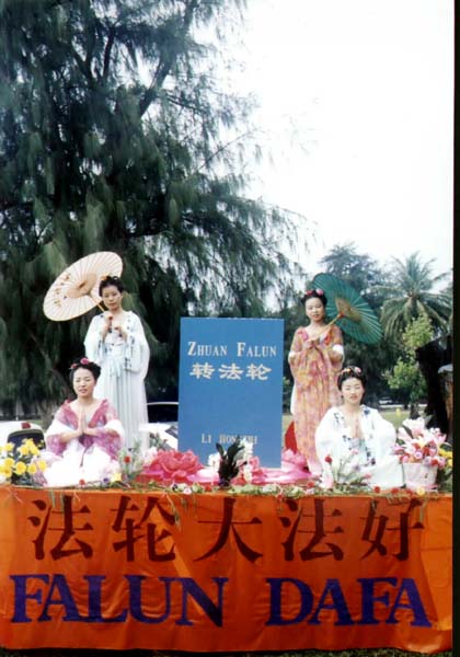 由4位身着古装的女学员、《转法轮》模型、法轮大法好和真善忍横幅、莲花等组成的大法花车吸引了人们的注意力,许多人争着和花车合影。大法弟子用手工制作的小花同大法书签粘在一起做成的小礼物供不应求。