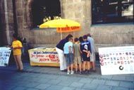 许多人拿了我们的信息材料,并观看照片,有些人驻足很久。还来了一班小学生,大约有三四十个孩子,进了我们对面的一个咖啡馆做午休。总有几个孩子过来,看了禁令前中国的孩子们炼功的照片后就问,到底发生了什么。孩子们不停地一会儿来几个,问些新问题,一会儿又来几个,细细地看,再问。