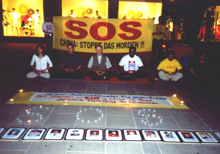 晚上,我们举行了烛光守夜。一些学员是从当地报纸获知我们活动的消息而赶来增援的。2002年6月26日中巴伐利亚报刊登此则消息:“为悼念1600在中国被迫害致死的和平的法轮功学员,雷根斯堡法轮功人员今天将在诺伊普法(Neupfarr)广场上举行烛光守夜。”