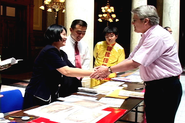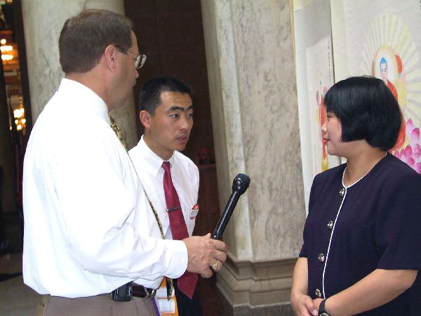 | 州参议员莫斯与章翠英交谈表示并支持法轮功 | 新闻发布会 | 章翠英女士接受WISH(CBS)电视台采访 |