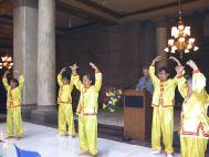 画展期间,章女士还拜访了州长、州议会主要官员办公室以及印第那普拉斯市长办公室。同时她用回中国为法轮功上访的亲身经历,详细地向政府官员们讲述中国法轮功学员为了真善忍的信仰所付出的巨大代价,并呼吁全世界善良的人们给予中国法轮功学员积极救援和帮助。印第安那州副州长当时就写了一封热情洋溢的欢迎信,高度赞扬了她的画艺及把美好带给了印第安那州。印第安那州州议员莫斯先生欣赏了章女士的画后,又和我们交谈,交谈中他告诉我们他去过辽宁锦州,我们向他讲述了在锦州的法轮功学员遭受的严重迫害后,他说他和锦州当地一些官员还有联系,他要给他们写信。在记者采访他时他说:“这些人(法轮功学员)是为了他们的信仰自由而抗争。这是我们的建国之本。他们的行为理应得到人们的支持。”学员们还为记者和观众表演了五套功法。