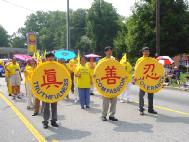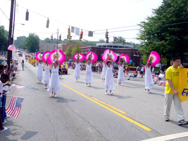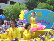 走在最前面的两位小弟子打着蓝底红字的“法轮大法”的横幅,庄严醒目;随后是由女弟子组成的舞蹈队,她们身着白裙,手执红扇,伴随着优美的音乐翩翩起舞,引来一阵阵由衷的赞叹:“真美啊!”紧接着的是以莲花装饰的彩车,几位学员坐在其上,向观众们展示着五套功法,充满了祥和平静的气氛。其后是一位西方学员表演功夫扇,刚柔相济,挥洒自如,赢得了众人的喝彩和掌声。走在最后的是游行方队,他们人人面带祥和的笑容,不停地向观众挥手致意,把“真善忍”的信息带给在场的每个人。