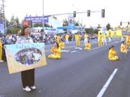 第8个游行-湖城“先锋日”游行,是美国西北地区最大的表演性游行之一。学员们齐心合作,金光闪闪的大法横幅,整齐的队形,悠扬的炼功音乐,第一和第五套功法的表演,加上三位身着传统中国服装的女大法弟子,向世人展示了大法和大法弟子的风貌。法轮功游行队伍荣获了成年方队表演组的第一名奖。