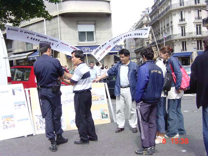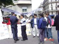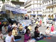 8月9日下午,部分学员来到中国驻法国大使馆前,抗议江泽民试图把迫害法轮功扩展到海外。学员们整点发正念,清除另外空间操纵人做坏事的邪恶因素。学员的活动得到不少行人的关注和鼓励,有的表示要到炼功点学功。