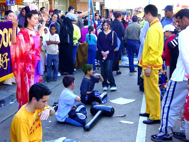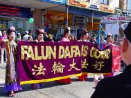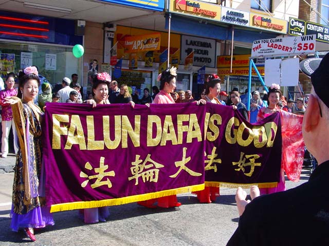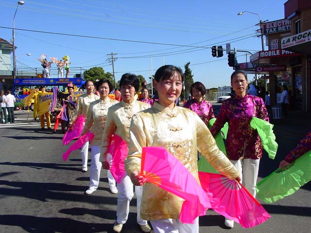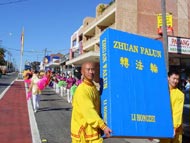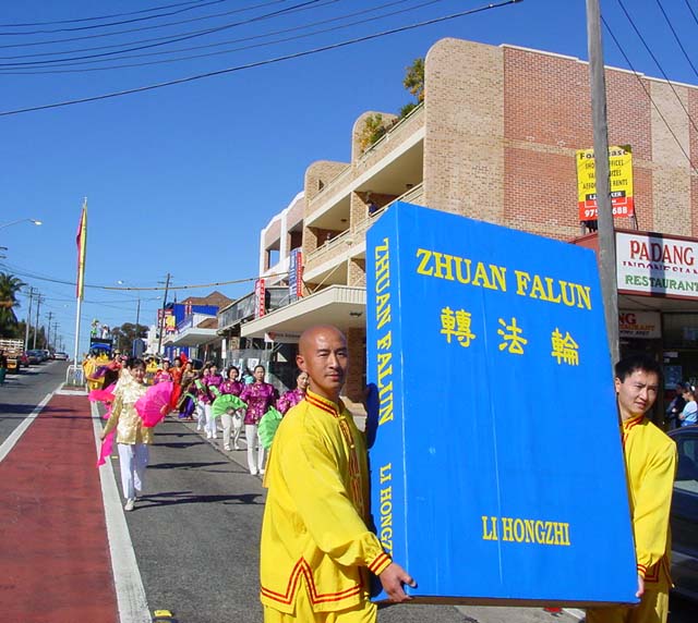 灿烂的阳光,使得正值冬末的悉尼今天如同夏日光临。上午10点半钟,“2002年哈顿(Haldon)街喜庆游行”开始,色彩亮丽的大法弟子的队伍,在整个游行队伍中格外引人注目。两位大法弟子抬着巨型《转法轮》书的模型、令人耳目一新的秧歌队和唐装服饰秀紧随其后,黄底红字的“庆祝澳洲法轮大法日”的巨型横幅更是醒目壮观。沿途市民欢迎掌声此起彼伏。