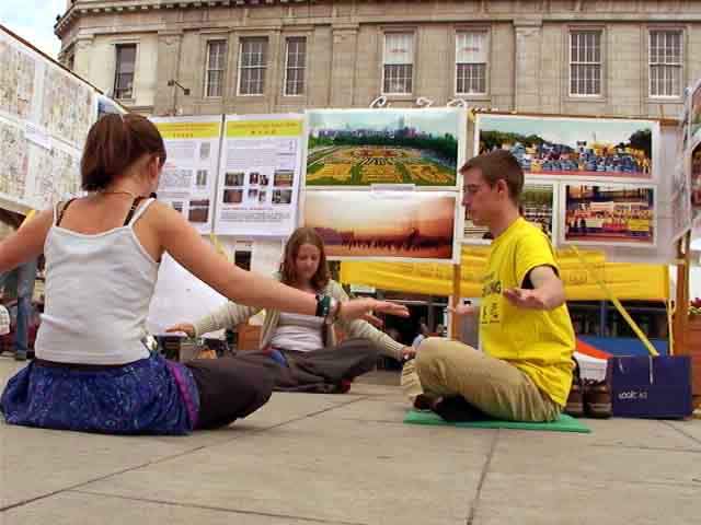 | 太阳周围的光晕 | 学员为行人教功 | 专注炼功的小女孩 |