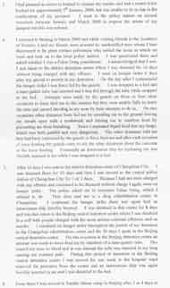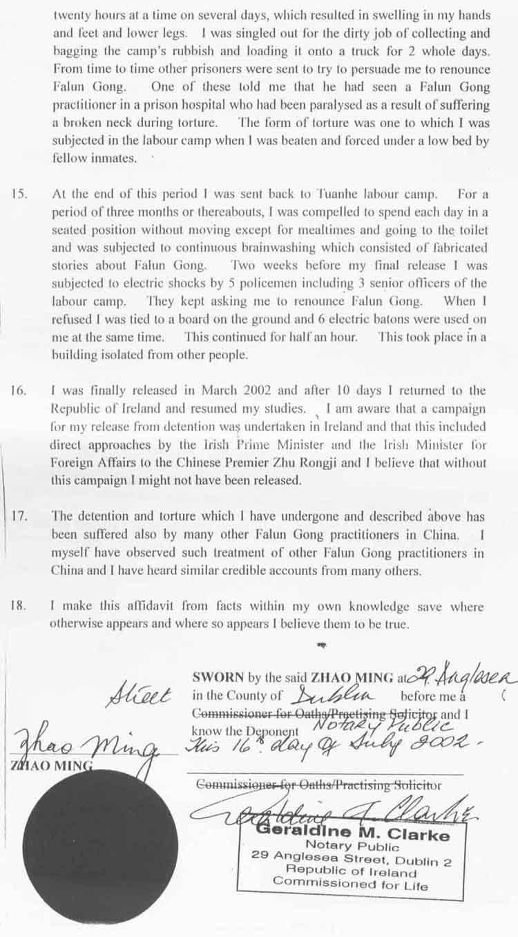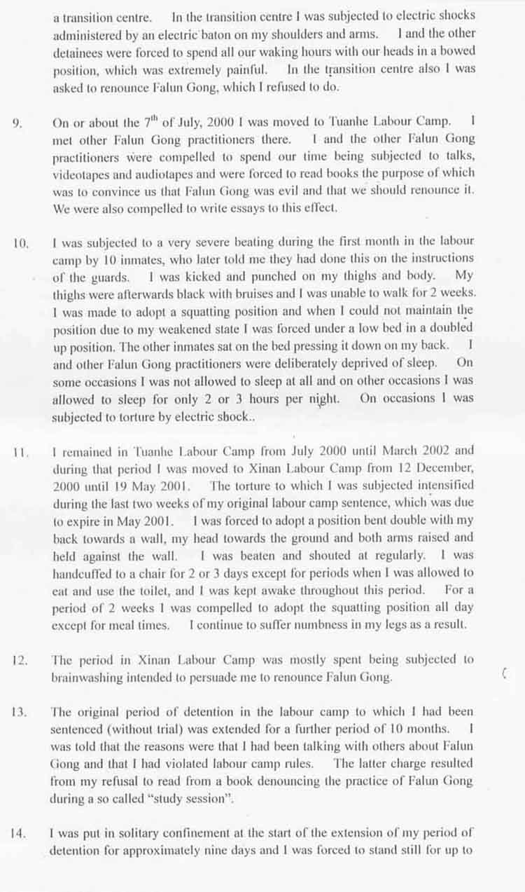 Ho, Tse, Wai and Partners律师事务所John Clancey律师要求我去香港为案号为WSC548,2002的刑事诉讼案中的被告作证,因为我曾经在中华人民共和国未经审判而被拘留和监禁过,原因是我修炼法轮功,并向那里的当局抗议它对其他修炼者的监禁和虐待。我无法前往香港,因为我没有(被中领馆允许申请)签证。因此, 我为上述诉讼案中的被告送上这份宣誓过的证词,以供使用。