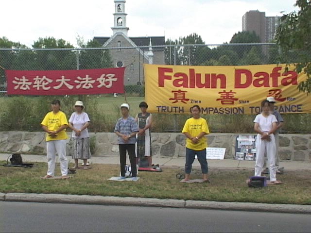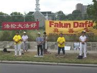 8月15日中午。渥太华学员在中国驻加使馆前抗议香港法庭对法轮功学员的不公正判决。