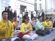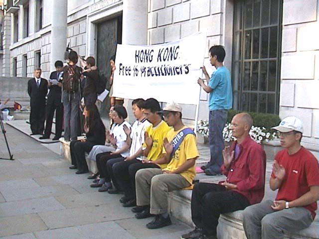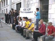 【明慧网2002年8月17日】8月14日晚,英国大法学会在伦敦中使馆前召开新闻发布会,呼吁英国社会关注目前在香港发生的对以所谓“阻街罪”遭起诉的16名法轮功学员的政治。英国议会议员考顿女士、前英外交官瑟罗勋爵、莫恩勋爵、欧洲法轮功之友副主席约翰、英国法轮功学会主席彼德在新闻发布会上分别发表演讲,共同谴责港府屈从中共压力颠倒是非,提醒国际社会──江氏集团对法轮功的迫害已延伸至香港,假手香港警方扼杀及伤害本地的人权和法治。英国部分大法弟子参加了这次活动。英国BBC的两名记者跟踪采访了整个活动。