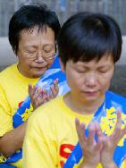 图片:法轮功学员8月12日在香港绝食期间打坐,要求北京(江泽民)当局停止镇压这一精神运动,并保护香港特区的自由。路透社/Kin Cheung
