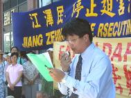 同是法轮功学员的电脑工程师福兰克代表大纽约地区的法轮功学员发言:“法轮功学员遍布世界各地,全世界千千万万的法轮功学员和支持法轮功学员信仰权利的善良人们、各国政府、机构也都在关注着在香港发生的一切。”在发言中他指出:“我们会持续地对这十六位学员表示声援。我们也会持续地呼吁国际社会、报界媒体及各界人士给予道义声援,共同终止这场对法轮功学员的无理检控及政治迫害,支持香港法轮功学员的信仰、集会、言论自由等一切合法权利。”