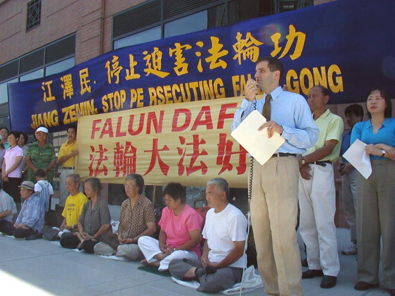 【明慧网2002年8月2日】法轮大法信息中心7月31日报导── 31日午12时15分,数十名大纽约地区的法轮功学员聚集在纽约总领馆前就香港警方检控和平请愿的法轮功学员一事举行新闻发布会,对香港能否保持其自由社会的特色从而保证其繁荣的经济文化表示深切的关注与担忧,并对香港警方不顾事实,粗暴逮捕法轮功和平请愿学员,无理检控,将在中国大陆对法轮功的延伸至香港表示愤慨。
